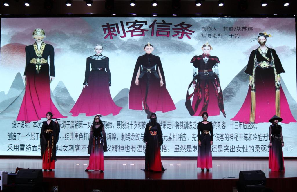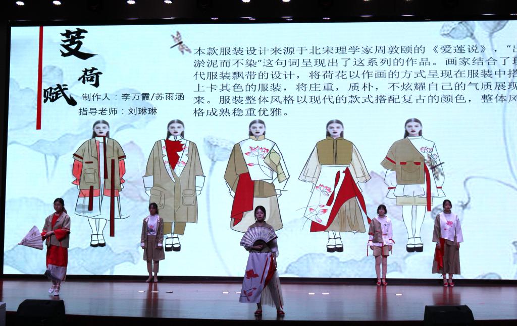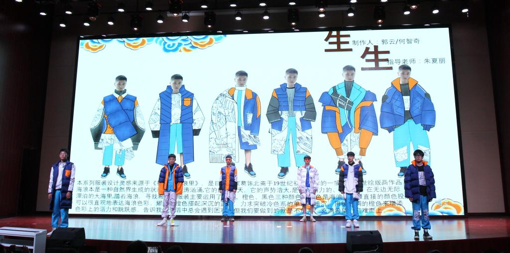 年轻的设计师们借裳抒志,将中国传统文化、城市、色彩、环保、涂鸦艺术等多种元素融入到服装设计当中,采用丝绸、面料再造、拼布等工艺,设计出时尚大气、不拘一格的服装。荷花、仙鹤等中国传统文化元素在舞台登场,独特的民族文化底蕴与时尚个性创意碰撞,展现了活力洒脱,超然物外的韵味。整场汇报演出时长60分钟,篇章衔接紧凑,节奏明快。T台上,青春靓丽的模特们穿上各具特色的服装,多方位诠释了服装设计创意理念,为观众呈上一场美轮美奂的视觉盛宴,赢得了阵阵热烈掌声。