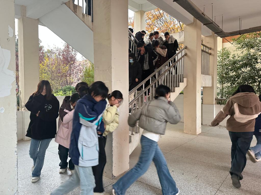 2023年11月27日下午16:25,现代服务管理系组织全体寄宿生在教学区联合汽车工程系成功进行了一次消防应急疏散演练。