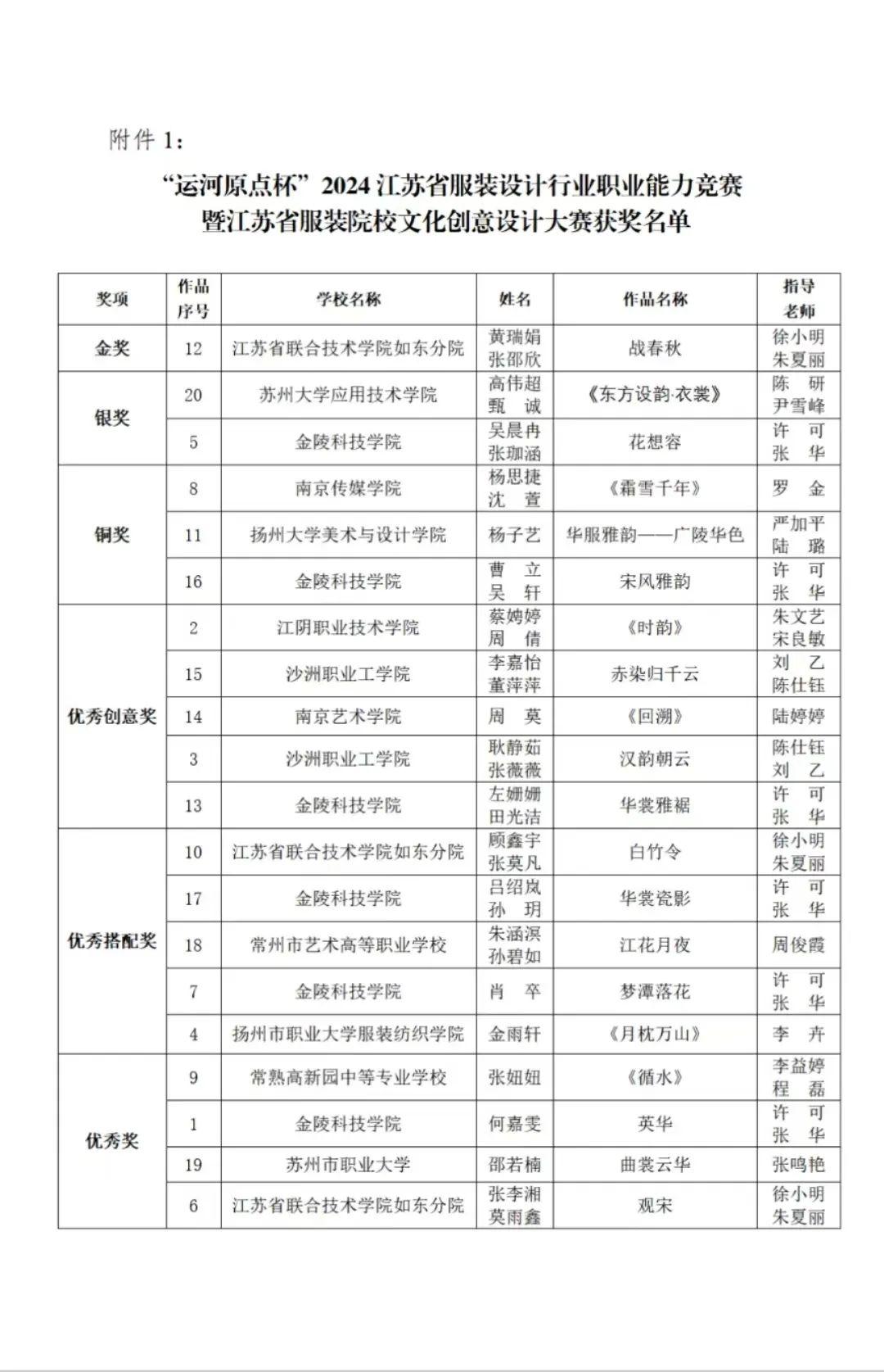 5月18日,扬州大运河原点公园内,一场以“华服雅韵”为主题的“运河原点”杯·2024江苏省服装设计行业职业能力竞赛暨江苏省服装院校文化创意设计大赛圆满落幕。经过初评,20份作品成功入围决赛,其中我校共有三件学生作品入选。作品《战春秋》在立体裁剪、理论考试、成衣评审三部分的综合评分中均获得评委团的高度评价,最终荣获金奖。此外,我校其他学生的作品《白竹令》和《观宋》分别获得了优秀搭配奖和优秀奖。