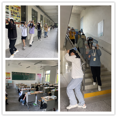 16点55分,急促刺耳的警报声响彻5号教学楼,全校师生立刻进入高度紧张的防震状态,所有学生迅速护着头、躲在桌子底下,做好逃生准备。连续的警报响起后,各班老师立刻组织同学们手持书本或书包等遮挡物,从教室里按照指定逃生路线安全有序撤离至操场,各通道重要位置均有老师指挥学生安全撤离。各班迅速清点学生数并汇报情况。
