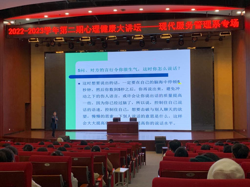 针对这一问题,2022年12月5日下午13:40,徐迅主任在大报告厅组织了现代服务管理系心理健康专场讲座。通过该讲座,帮助同学们认识到不合适的表达会伤人,要想建立和谐融洽的人际关系就要学会好好说话,就要学会如何说话。