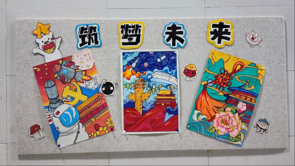 “筑梦未来”板块聚焦青春与未来的对话。航天主题的手绘作品里,宇航员、火箭与党徽同框,寓意着在党的引领下,青年一代以科技逐梦、以信仰领航;城市科技景观的创作中,飞天列车、智能建筑尽显对未来发展的畅想;传统中国结与古典建筑的融合,则体现了在强国之路上对文化根脉的坚守。这些作品不仅是艺术创作,更是22婴幼儿托育服务与管理专业学子的自我宣言:他们将以专业为笔,在托育领域耕耘,为祖国未来的“花朵”筑就成长之梦。
