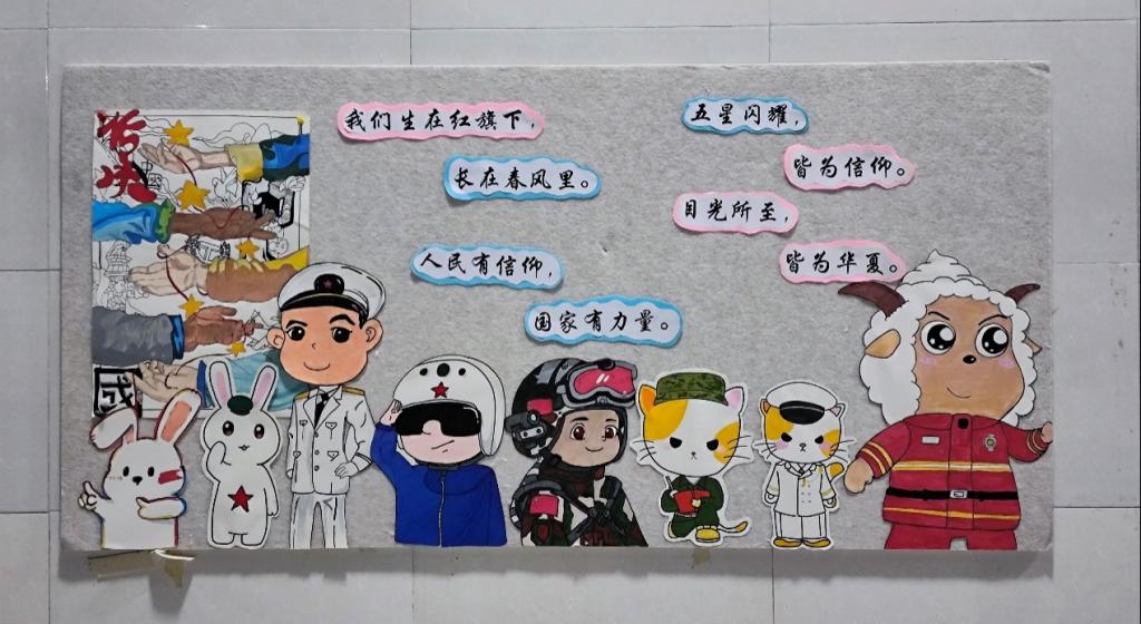 最后一个板块以暖心文案与萌趣形象,抒发了青年学子的爱国深情。 “五星闪耀,皆为信仰;目光所至,皆为华夏”等文案真挚动人,搭配身着不同职业装的卡通形象与军人、消防员等职业角色,既展现了社会各行业为强国梦奋斗的群像,也暗含托育学子对“培育有信仰、有担当的下一代”的职业追求。手绘作品中“接力式”的五星传递,更是将个人成长与国家发展紧密相连,诠释了“人民有信仰,国家有力量”的深刻内涵。