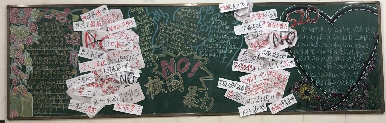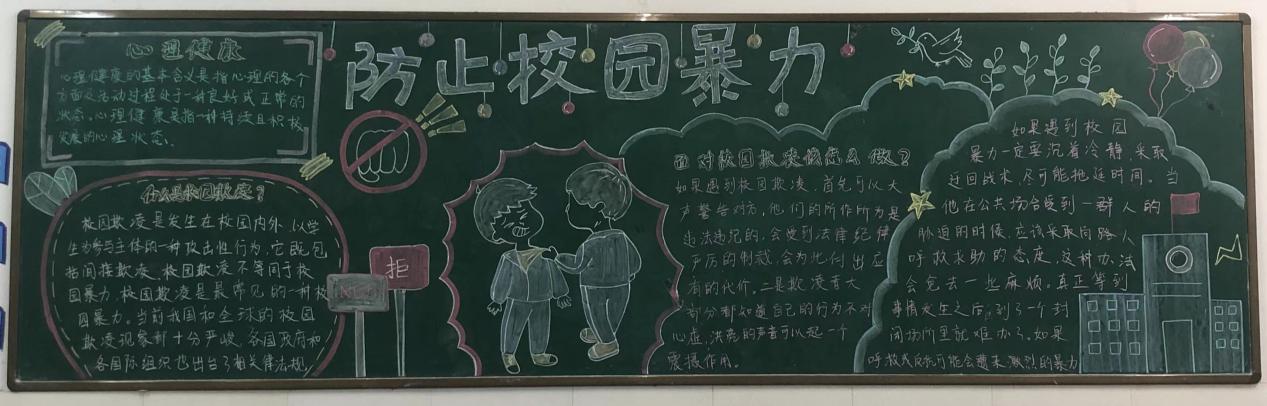 为丰富学生校园文化生活,同时加强防范校园欺凌,在校团委的组织下举行了“反校园欺凌”主题黑板报活动。