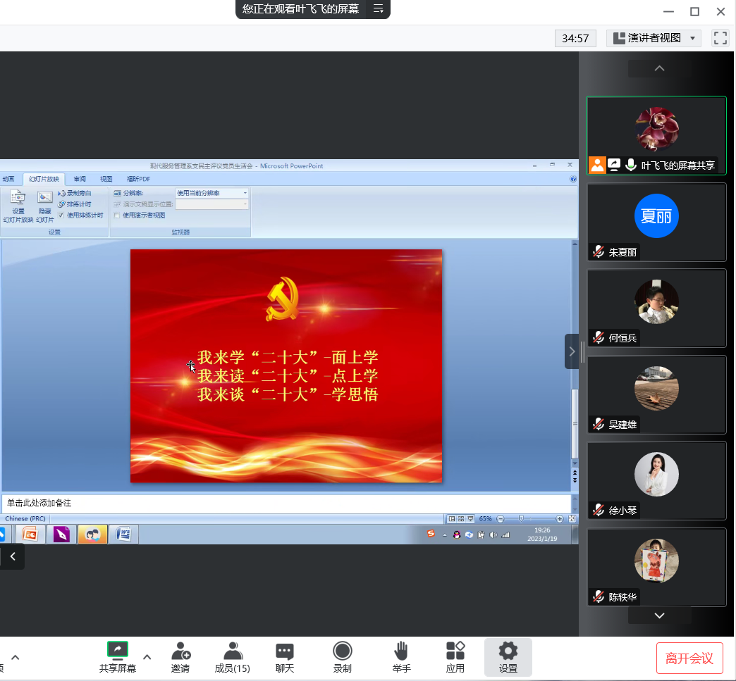 首先,现代服务管理系党支部书记叶飞飞同志带领全体党员同志学习《习近平总书记二〇二三年新年贺词》及近平总书记重要文章《为实现党的二十大确定的目标任务而团结奋斗》。接着叶飞飞同志带领大家进行民主议事,每位党员同志都结合自身情况对2022年度的教学工作、班主任工作、安全工作等方面作总结,并纷纷发表了各自的对2023年工作意见和建议。接着叶飞飞同志带领大家观看了电视专题片《永远吹冲锋号》。