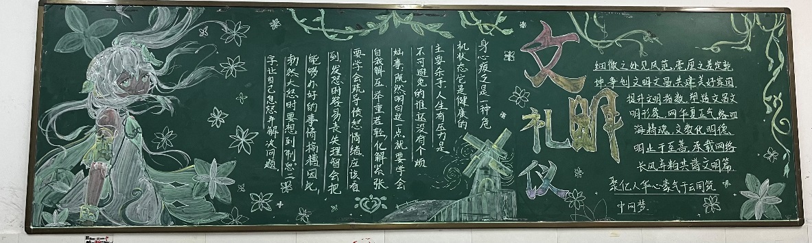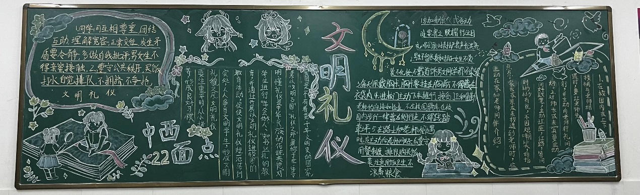 为丰富学生的校园文化生活,同时也加强了学生们对于文明礼仪更深刻的认知,十月我们学校开展开了关于“文明礼仪”黑板报主题活动。主要目的在于告知大家知文明,懂文明,讲礼仪!